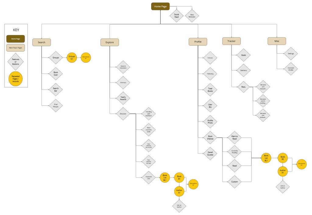 To understand the organization of the redesigned app, I created a sitemap that mapped out navigation and page accessibility from the home screen. This process allowed me to organize features into their most relevant pages, ensuring a logical and user-friendly layout. This sitemap also served as a reference during the sketching phase, providing a clear overview of how Goodreads’ features interact with each other.