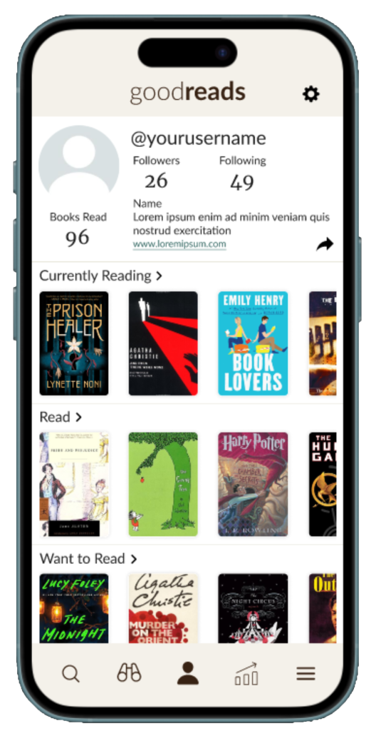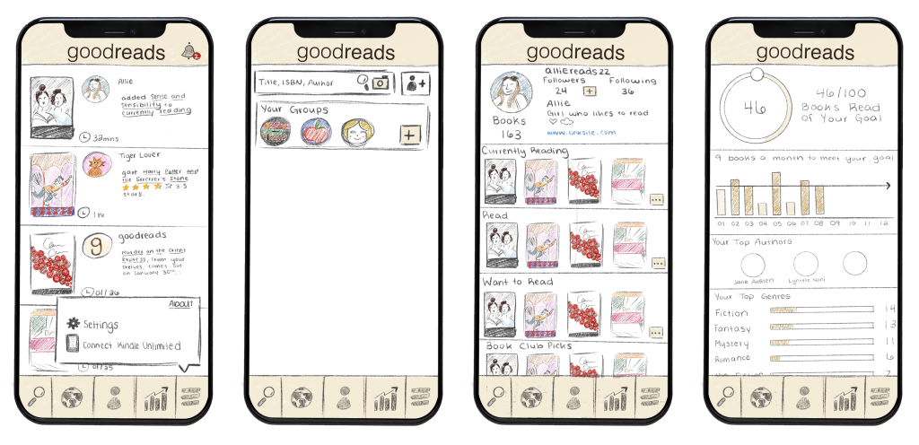 Using my sitemap and sketches, I developed a high-fidelity mock-up of the redesigned Goodreads interface in Figma.
