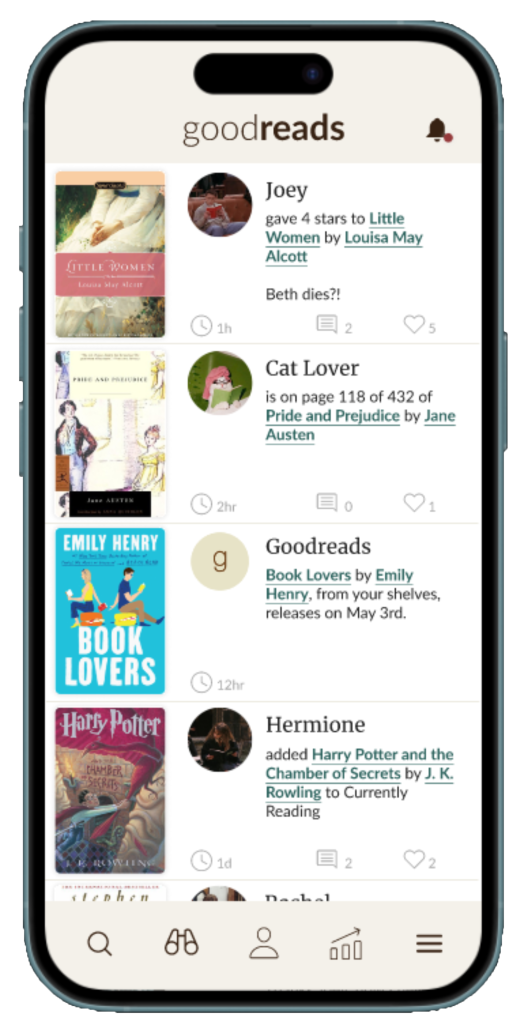 • Interface focuses on individual books and shelves, limiting opportunities to connect with other readers